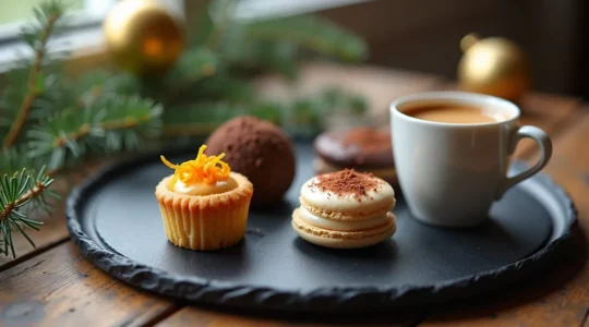 Après un repas copieux, le dessert doit apporter une note de fraîcheur. Le café gourmand est une excellente alternative à la part de bûche classique. Il s’agit d’un assortiment de mignardises qui joue sur la règle des « trois textures » :